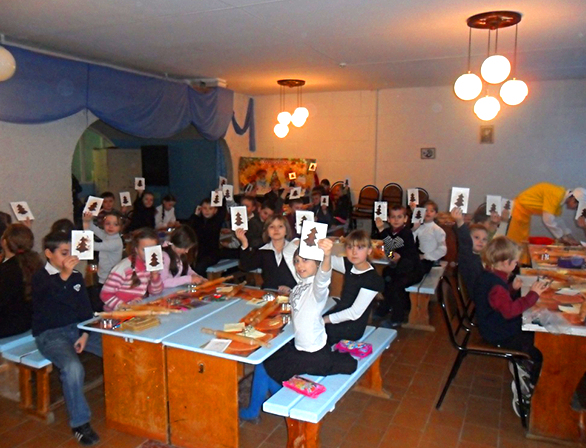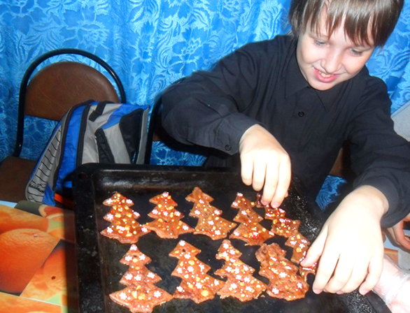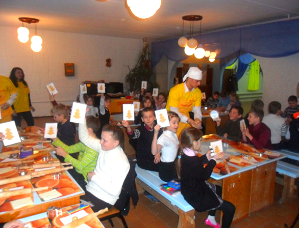 На глазах у ребят кондитер замешивает тесто, используя только натуральные ингредиенты – яйца, сахар, муку, какао и конечно же «Хозяюшку». А затем с помощью формочек ребята делают из теста печенье в виде елочки, украсили их цветной крошкой и отправляют в духовку. Пока лакомство готовится, ребята декорируют праздничную упаковку.